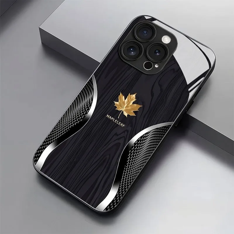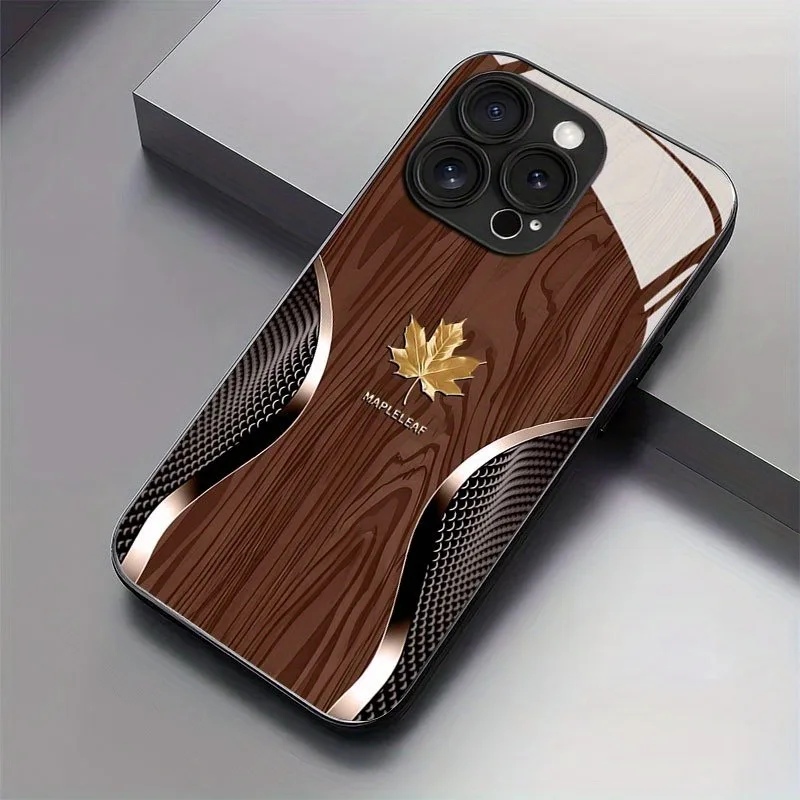 • Luxury Maple Leaf Wood Grain Curve Pattern Glass Phone Case For iPhone