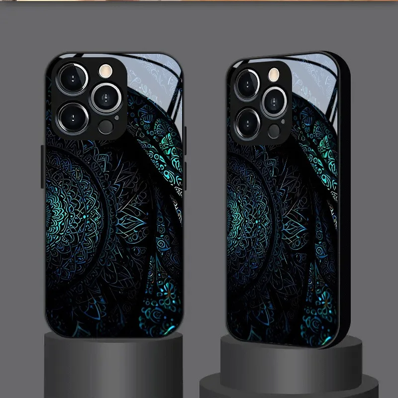 Brilliant Mandala Pattern Tempered Glass Black Phone Case For iPhone